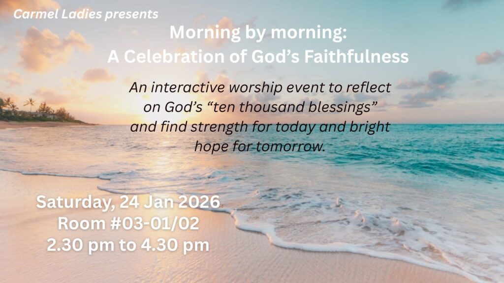 It is time to slow down! The Ladies Ministry is organising a contemplative walk open to all ladies in Carmel, taking place in West Coast Park on the morning of 9th November from 8.30 to 10.30 am. The walk focuses on solitude and prayerful conversations with God in the midst of His creation, building appreciation and awareness of God’s presence with each person. This Contemplative Walk itself is slow, pausing to use all our senses to see, hear, feel, touch and taste God’s creation. Facilitation and reflective questions will be provided. Do sign up, and for access to a phone number for any enquiries. The walk is open to all ladies of all ages, and you are free to bring a friend.