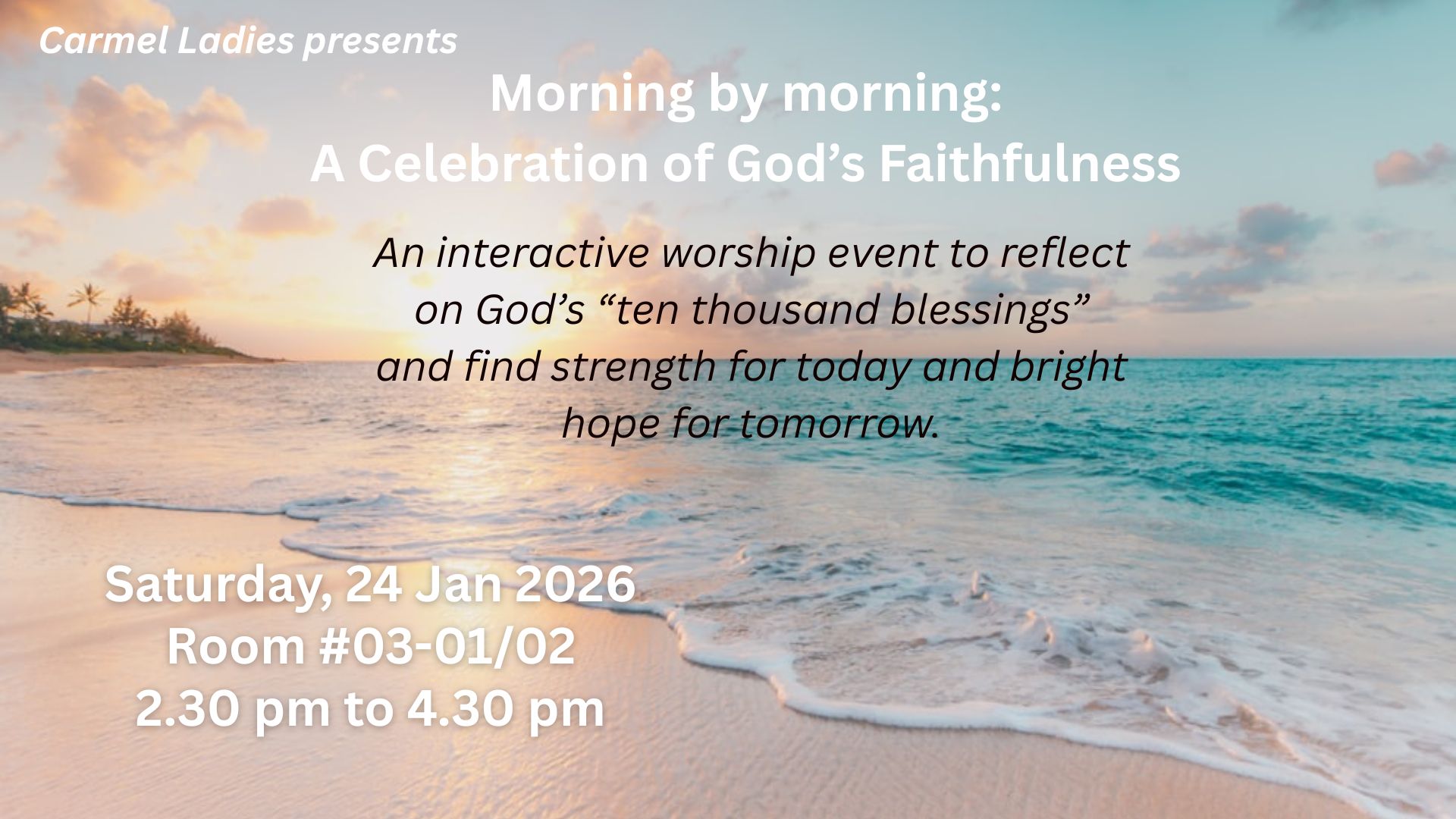 You are warmly invited to an interactive worship experience, “Morning by Morning: A Celebration of God’s Faithfulness,” happening on Saturday, 24 January, from 2.30 to 4.30 pm.